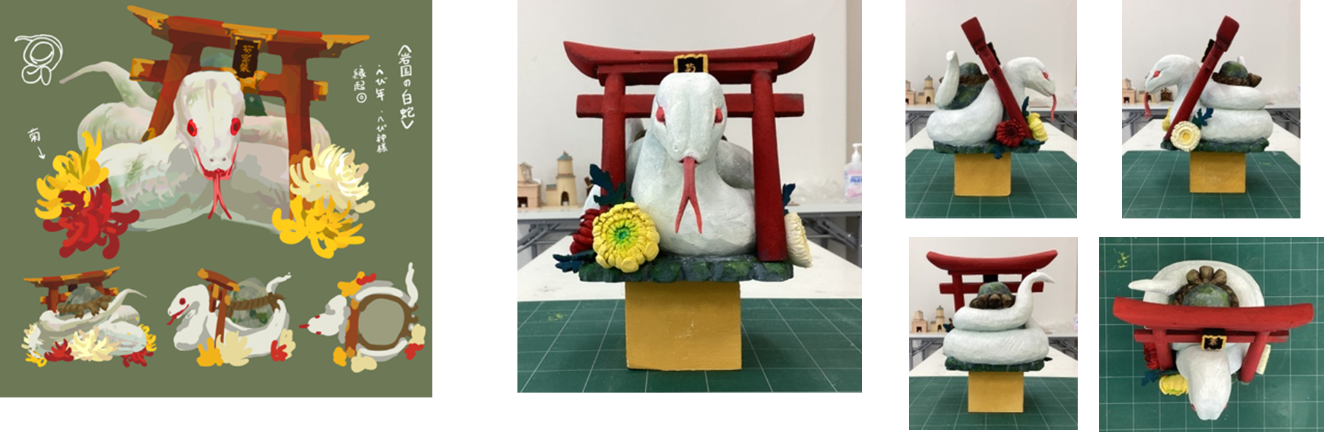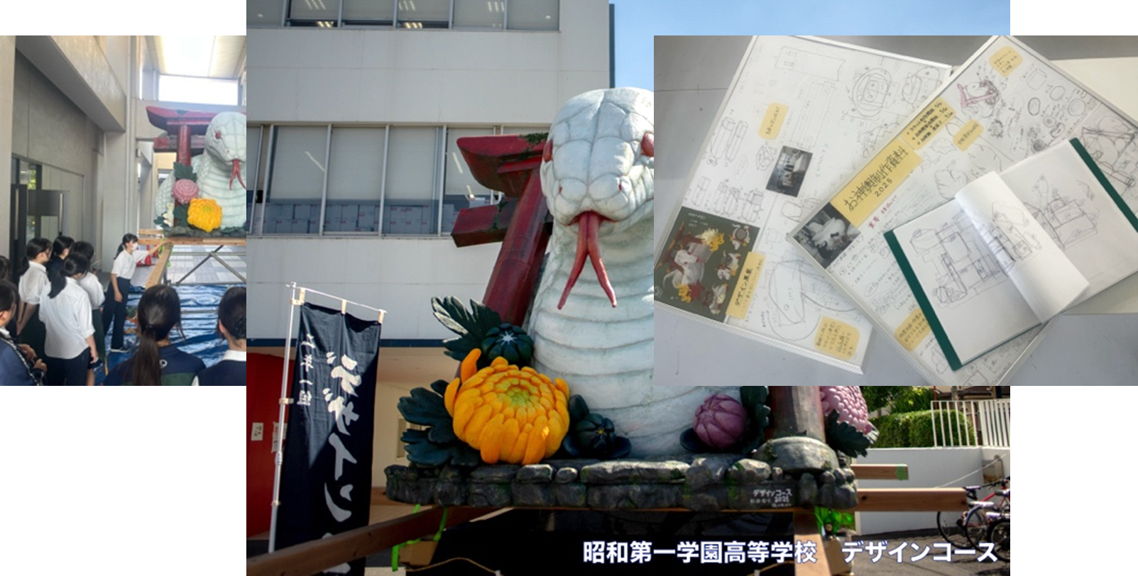 2025年の干支である巳(へび)をテーマに、デザインコースが末長く続いて欲しいという願いを込めたデザイン。縁起の良い白蛇と、菊葉祭の「菊」をモチーフにして鳥居の額にも「菊葉祭」の文字を加えた。威厳と華やかさを両立させ、デザインコースの始まりを飾る御神輿にする。