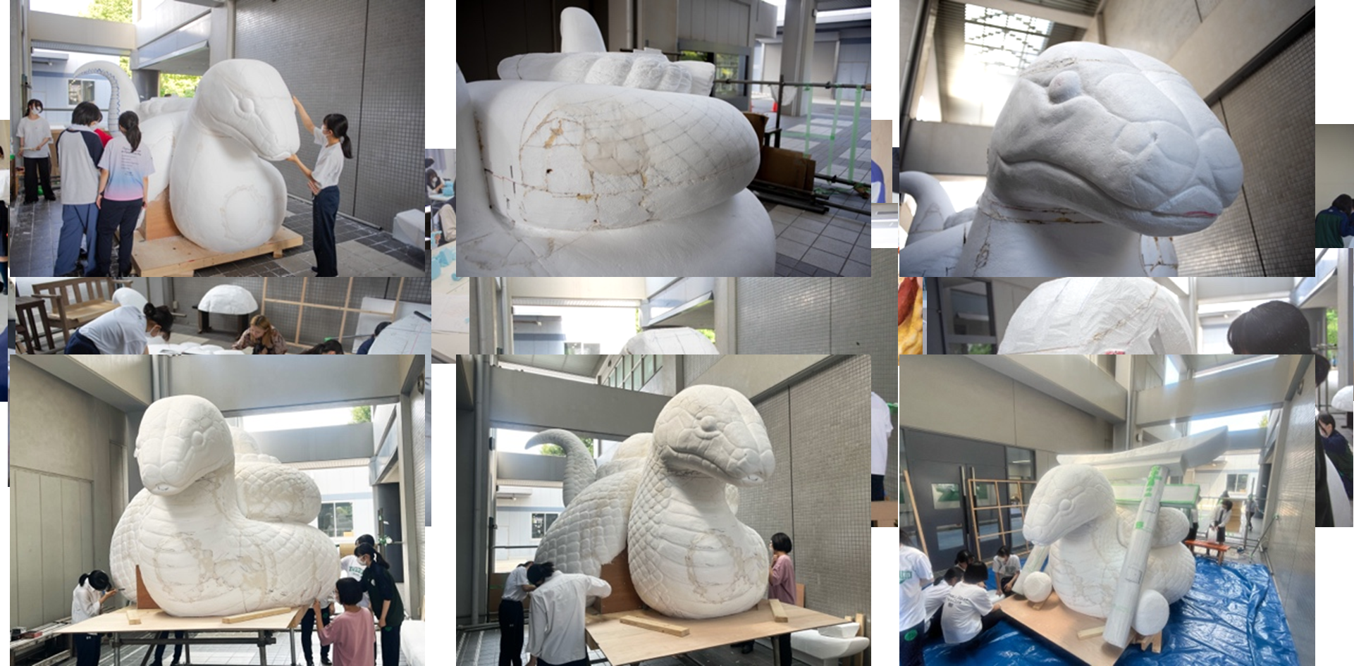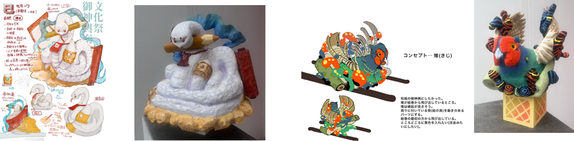 この御神輿は東京藝術大学の藝祭の名物である御神輿を目標に、5月からデザインから考え、小さな模型を作り、そこから夏休み期間も使いつつ発泡スチロールや木材を組み合わせ造形し、高さ約2.5メートルの巨大な御神輿の制作に2年生全員で挑戦します。