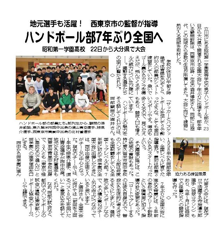 ハンドボール部の全国選抜大会に関する記事がタウン通信という多摩地域のタウン誌に掲載されました。