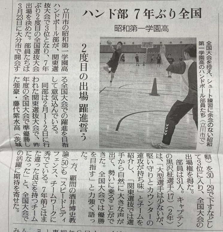 2月28日の読売新聞に、本校ハンドボール部の全国選抜大会へ向けた記事が掲載されました。
