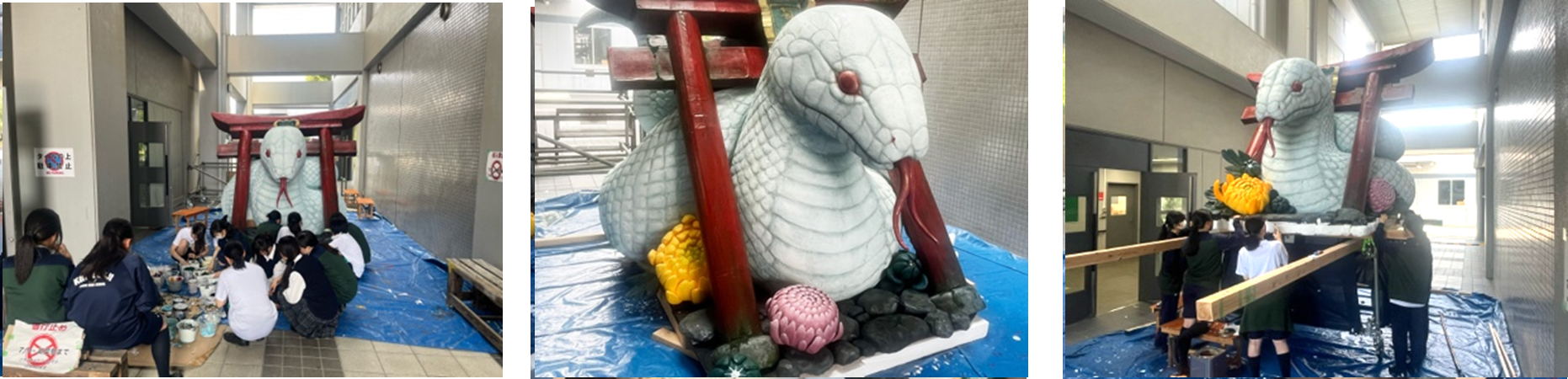 2025年の干支である巳(へび)をテーマに、デザインコースが末長く続いて欲しいという願いを込めたデザイン。縁起の良い白蛇と、菊葉祭の「菊」をモチーフにして鳥居の額にも「菊葉祭」の文字を加えた。威厳と華やかさを両立させ、デザインコースの始まりを飾る御神輿にする。