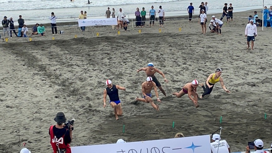 ライフセービング競技は、海辺のレスキューに必要な技術、体力、精神力を高め合う「生命をまもる」スポーツです。部員にとってはハードなコンディションでしたが、あきらめずに挑戦していました。